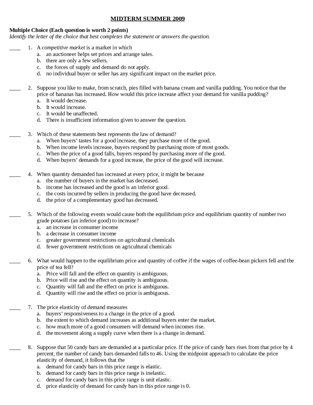 Questions Of Principles Of Microeconomics Midterm Econ 200 Docsity