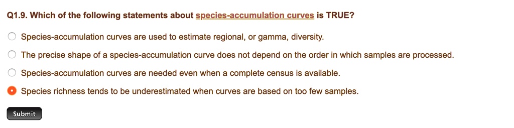 Solved Q1 9 Which Of The Following Statements About Species Accumulation Curves Is True Species Accumulation Curves Are Used To Estimate Regional Or Gamma Diversity The Precise Shape Of A Species Accumulation Curve Does Not Depend On